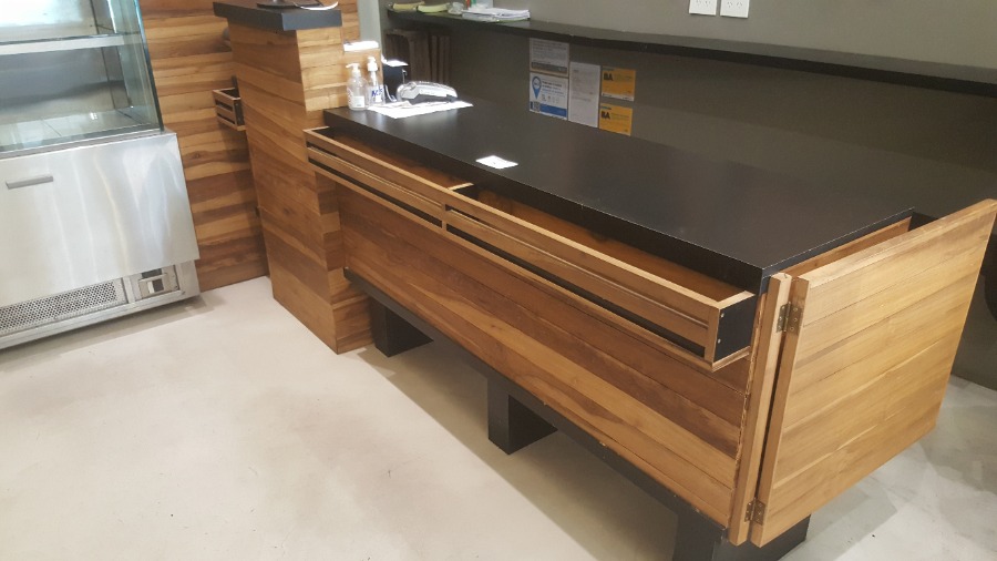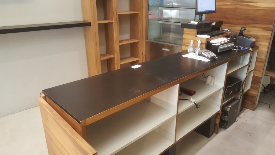 Mostrador todo en madera de 8 compartimentos + puerta y mueble caja con alzada – 2,50 m x 59