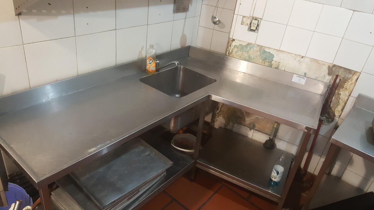 Mesada de trabajo en L con bacha (50x40x30) y canilla + estante – toda en acero inox – 3,05x60x85 alt